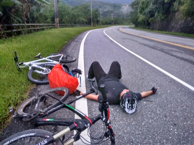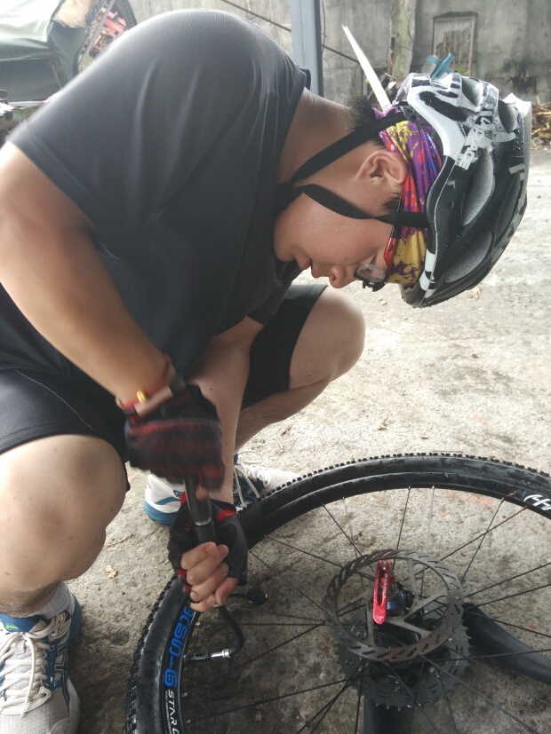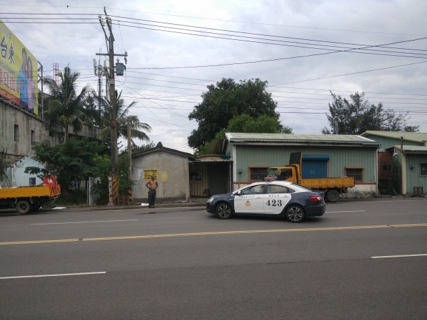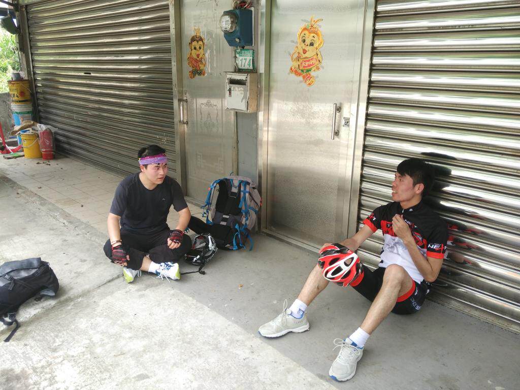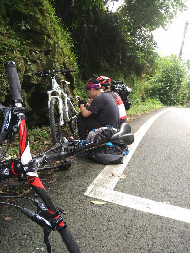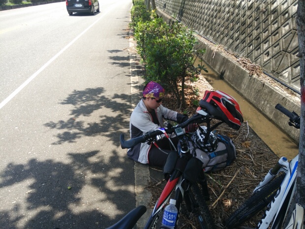 这里一天有些尴尬哦,如果我们骑多点会到达最后的一段山路,据说那是前不着店后不着村的地方,如果少骑点的话,我们的行程又会比较少,最终凯娃怕撑不下来,选择了后者。不过旅行嘛,总有戏剧性的事情发生,在途中凯娃儿的车胎暴了,当时我们还在说幸好你带了两条备胎,现在派上用场了,哪想到由于外胎的刺没有清理干净,没骑多远就又挂了,当我们把希望寄托在那最后一条备胎上时,备胎又因为质量问题打不进气……怎么办,最后只能求助110了(没错,台湾那边的民警也是110哦),就这样,凯娃人生第一次坐上了警车。