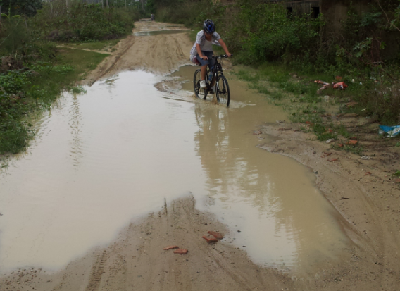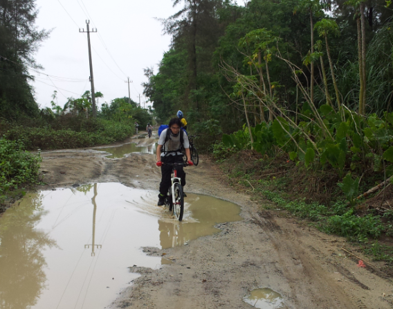然后我们绕路了,实际顺着海岸边的绿化带走就行。大概走1KM就会遇到修路的便道,这条路在雨天很难通行,因为是泥路,雨天就是泥水路。当天早上下过雨,我们就比较悲剧一路的水洼,不过出来玩各种地形都走走也会是一种不错的体验,一马平川的路反而对广大骑行者来说没多大吸引力吧?