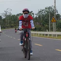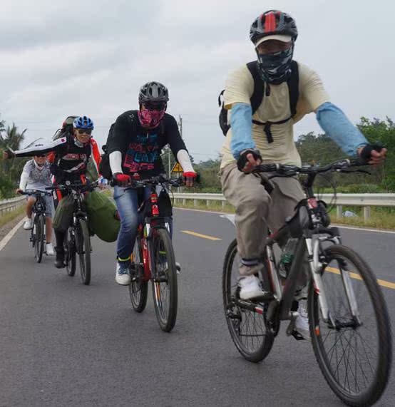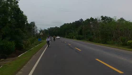 早饭和午饭是一起吃的,离开灵山镇没多远的路边一家湘菜馆,这次吃饭使我初次认识到了海南吃饭的点餐过程。在海南吃饭一般都是去厨房点菜,厨房有什么菜才能点什么菜。在这里啰嗦一句单独住宿或吃饭比几个人一起分摊会贵得多。吃完饭上路就已经正午了日头正毒,在海南骑行一定要做好防晒,就算是阴天一样能被紫外线晒伤。前行三江镇附近遇到了我环岛的前两个全程同伴:来自海南大学同学兼室友爆胎哥和林妹妹。令人惊奇的是爆胎哥和林妹妹是第一次长途骑行,在此次骑行之前都很多年没碰过自行车了。他们俩的车都是当天租的,当然正是因为他们的车是租的才导致爆胎哥的车全地形胎磨成了光头胎一日两爆,林妹妹的车不能变到最小的牙盘上长坡超累。与号称穷游的我一套骑行装备相比,他们俩租车的同时还送头盔和绑腿,防晒面罩和袖套是他们自己用旧衣服改的。