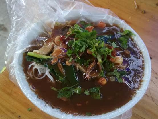 分赃销账完毕后,我们一行9人的临时队伍继续向陵水县进发。下山后一直是平路轻松35KM/H拉到陵水县G223与高速公路G98的交汇处吃午饭。午饭是在一家阿婆开的路边摊吃的是著名的陵水酸粉+咸鸭蛋,那个小摊的名字只记得叫“X婆酸粉”吧。我这样介绍是有原因的因为这个酸粉真心好吃,我们每人至少吃了两碗酸粉。嗯嗯她家上小学的小萝莉也挺可耐,中午放学了还要到婆婆的酸粉摊帮忙。