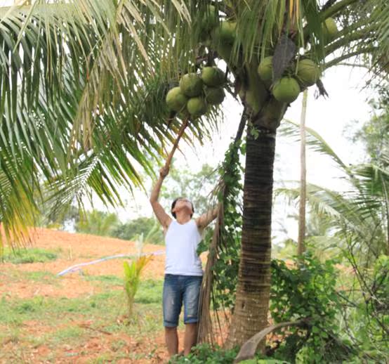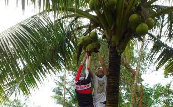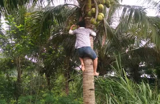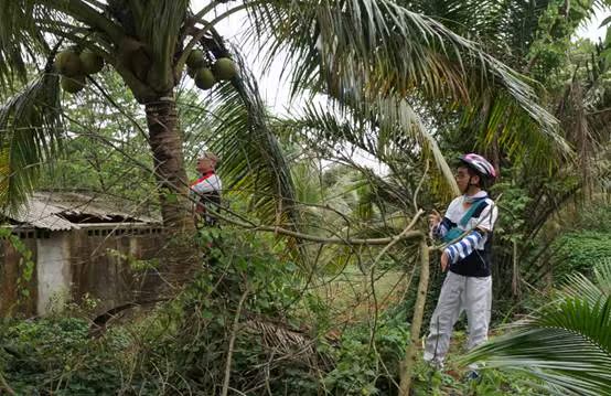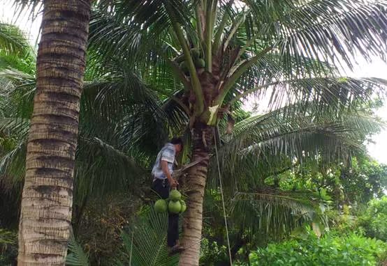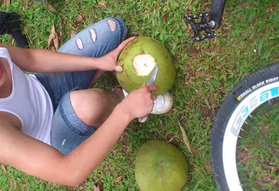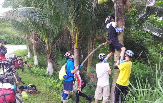 经过几次的拉爆后,前面的爆胎哥本打算在一个坡顶休息,一不小心发现路边有一颗很矮的椰子树,然后就经历了很多到海南环岛骑友的保留节目:偷椰子!呃,路边的野生椰子树不能算偷,只能说摘,对的:摘椰子!