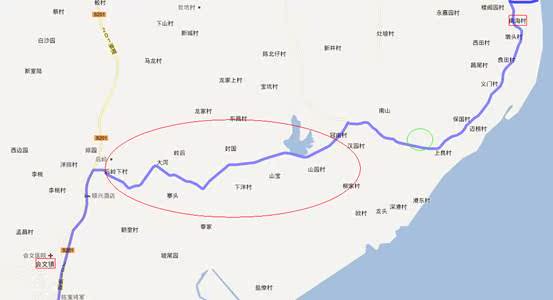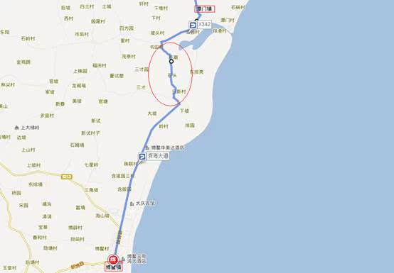 路线图潭门镇~博鳌镇,红色椭圆为超级搓板路