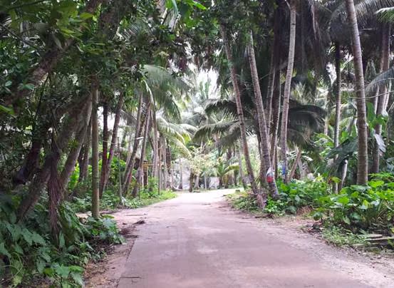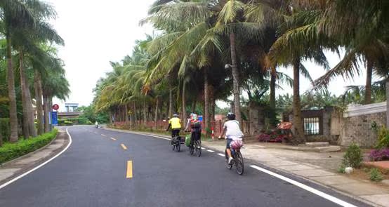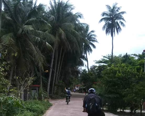 出了这条泥水便道后我们就到了南海村,大家都是一车的泥沙,光胎哥还刹车碟片进沙。在南海村洗车,买水,上油,沿着一条椰林掩映村道继续走,一路风光大美,真心醉呀!很喜欢那种在树林里穿梭的感觉,空气又一级棒,我们一群人在这骑得很开心,感觉前面泥水路的辛苦都是值得的。