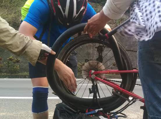 爆胎哥有补胎经验很熟练就自己补好了胎,交给我估计没一个小时补补好……继续上路后补充了食物的上海车友就逐渐超过我和爆胎哥开始在前面破风。跟骑的时候我们车距很小就半个轮子的距离,一路就上到了一个隧道口。到了隧道我们分配一下队形,有尾灯的我押后,以15KM/H左右的速度缓慢通过隧道。一出隧道上海车友中的大行小折爆胎,大家又停下来等队友补胎。