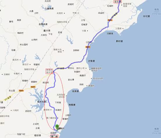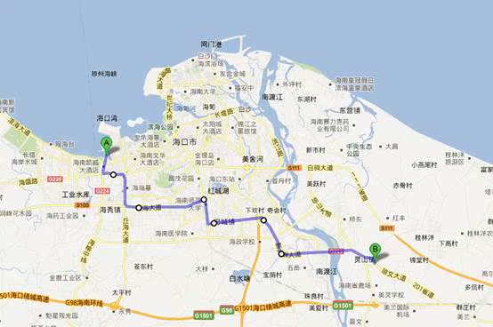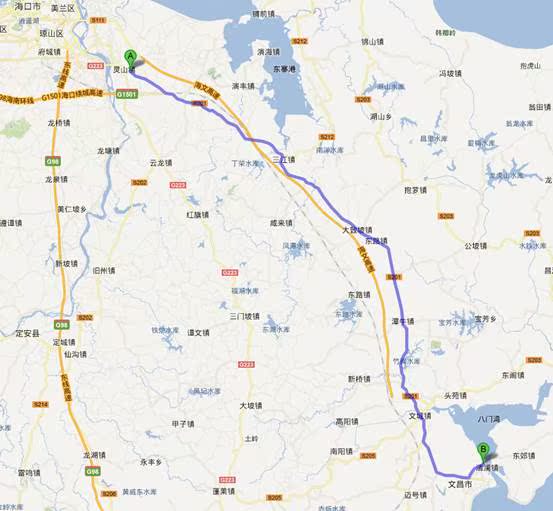 途径:海口港~灵山镇~三江镇~大致坡镇~谭牛镇~文昌~清澜镇