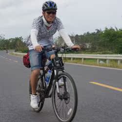 遇上他们的时候金大侠已经因意外受伤,虽然一直是较缓的起伏路,但此时又一直是南风,所以速度并不快一直保持在20KM/H左右。一路上我们相互鼓劲,谁体力不支了就到后边跟骑,后半程我不知道为什么肚子疼,在金大侠身后跟骑了很久。到文昌以前,我们在路边休息时,我挥手向后边的同伴示意停车,但同伴身前我正对着有一辆当地货架里载着番石榴的摩托车,这一招手将摩托车招停了。当时就觉得脸上挂不住,一阵脸红,还好反应比较敏捷,买了几个番石榴,至此以后整个海南之旅我没敢再向同伴招手。