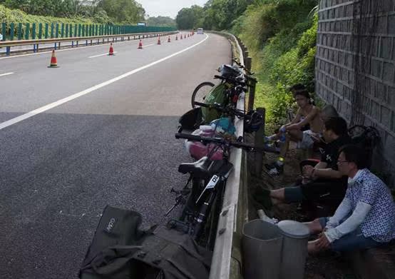 吃饱休息够了以后我们一行人对接下来该怎么走产生严重的分歧,我、爆胎哥、金大侠赞成走高速G98,13.5KG、光胎哥、林妹妹打算继续走国道G223,三位上海骑友随便……三比三打平没法决定到底走那边,最后双方都无法说服对方就各走各的,分成两队后三位上海车友决定跟我们走高速。一行6人顶着烈日上了高速,爆胎哥因为年轻体力好一直担任破风的任务。休息两次后我们把金大侠给丢了,金大侠在后边估计有点中暑了。到达英州镇出口,日头依旧狠毒,我和爆胎哥还有上海车友左等右等不见金大侠,电话联系金大侠后,得知金大侠已经不能继续前行,已经让他表哥开车去接他了,我们队减员一人……我像昨天在万宁北出口一样打开草坪的灌溉用书冲头,水一到脸上就觉得不对:有味道!然后我提议大家下高速到英州镇找个茶馆喝茶,躲一下恶毒的太阳,大家都赞成。喝茶的时候上海车友买了些饼吃,我和爆胎哥感觉没饿就没吃,后来才知道当你感觉到饿的时候早就骑不动了。躲了一个半小时太阳下午4:30我们继续踏上行程,这时候我和爆胎哥还在前面,上海车友在后边跟骑。中途休息的时候碰见第一天见的3个北京学生,当大家休息好了的时候爆胎哥开始了他一日两爆表演:第一次爆胎。